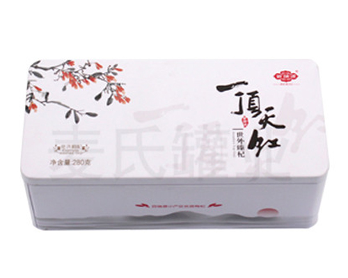 这款宁夏枸杞铁盒包装,采用国产马口铁制造,可根据市场的需求或客户不同的材质要求。客户可选择0.23MM~0.38MM之间的马口铁/磨砂铁进行制作。这款国杞天香枸杞铁盒,采用专色印刷工艺,可使铁盒的外观颜色更加精美别致,无污点。麦氏罐业为客户提供专色或四色印刷工艺进行选择。