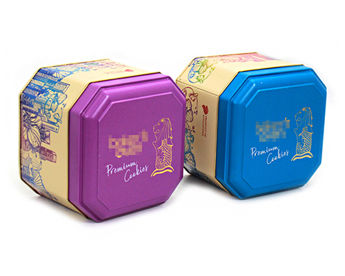 这款饼干铁盒包装_八角形食品马口铁盒包装,采用0.23mm厚度马口铁为铁料,国外制罐设备和技术打造而成,四色印刷工艺,外卷线盖设计,此款饼干铁盒包装一上市,就得到广大消费者和客户的各种青睐。