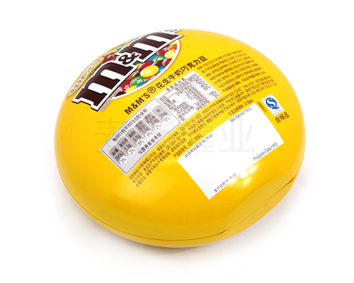 名称: 花生牛奶巧克力豆铁盒,圆形糖果包装铁盒