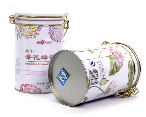 此款蜂胶铁盒为经典的圆形造型设计,铁盒的外造型为带铁扣锣底、塑胶盖结构,此款铁盒的设计具有优异的防潮、密封性能的特点;尺寸为100*159mm,可包装300克的荷花蜂花粉产品,能满足大容量的产品包装需求,客户还可根据自身产品包装的要求选择方形、异形、心形等其他造型的设计,我司尽力满足客户多方面的定制需求。